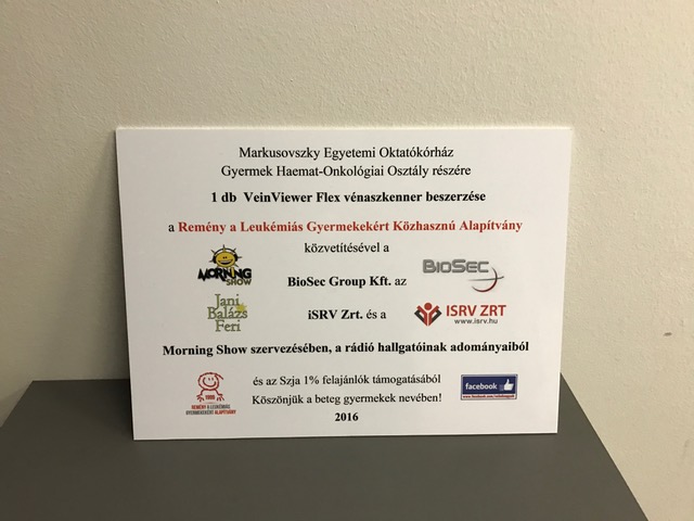Az iSRV Zrt. A Biosec Group Kft.-vel közösen adományt adott a VeinViewer Flex vénaszkenner készülék beszerzésére, mely a beteg gyerekek életét teszi könnyebbé.